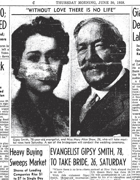 I was reading about the famous preacher named Gipsy Smith (1860-1947), who was 78 years old when a 26 year old woman married him (see an actual news clipping to the right from June 30, 1938 - Click picture for a larger photo). She was a going away present for him, I'll tell you Brother! I'm envious! Gipsy died in 1947.
